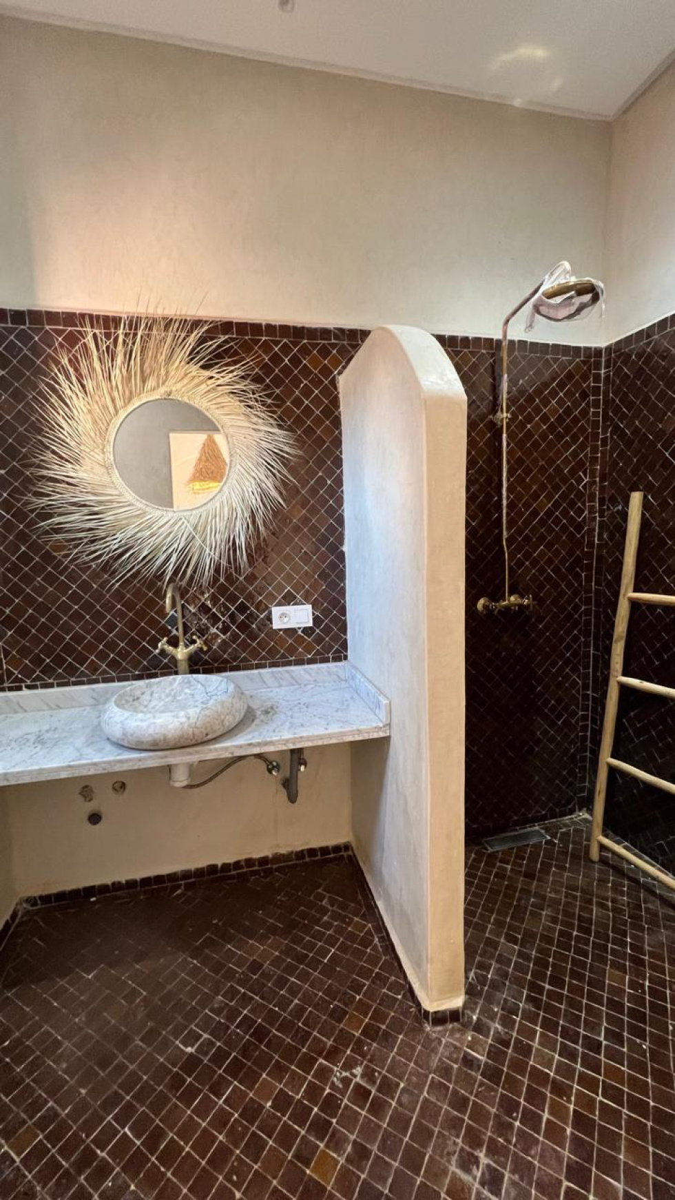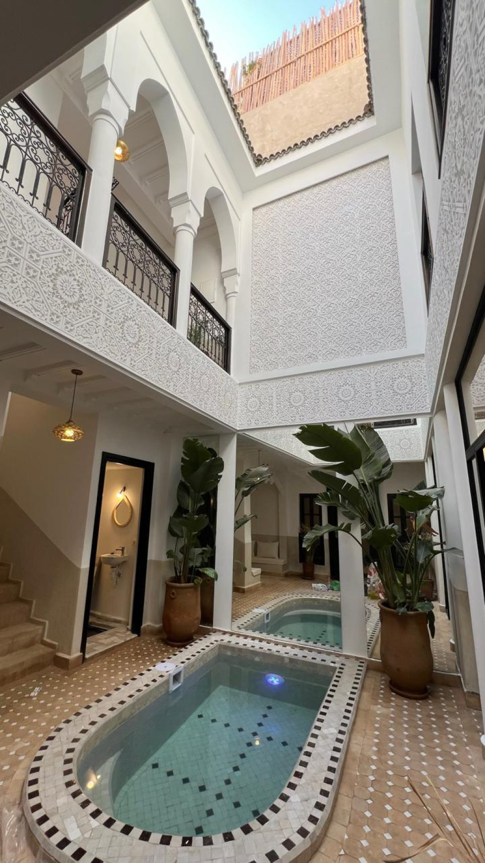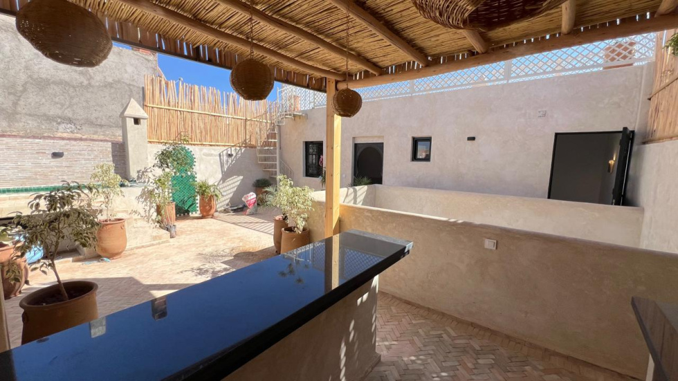 Situé à 7 min à pied de la place Jemaa El Fna, dans l'un des meilleurs quartiers de la Médina, vous pourrez découvrir ce riad très bien décoré et aménagé avec beaucoup de goût qui se compose au RDC : 1 hall ouvrant sur 1 patio avec bassin, 1 salon avec cheminée, 1 cuisine, 1 chambre avec SDE, 1 bhou et 1 wc. Au 1er étage : 3 grandes chambres + 3 SDE attenantes. Toit : 1 cuisine d'été, 1 grande chambre avec SDE, 1 jacuzzi à l'abri des reagrds et 2 TERRASSES. Vue à 360° sur l'Atlas, la Koutoubia et le moyen Atlas. Inconvénient : vous ne l'avez pas encore vu !... HFA