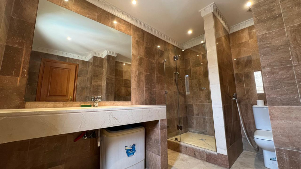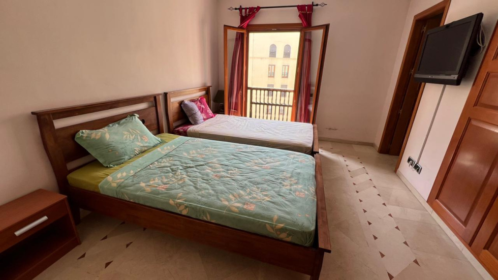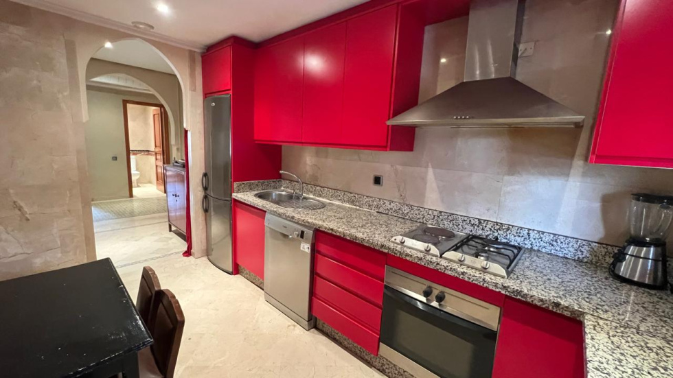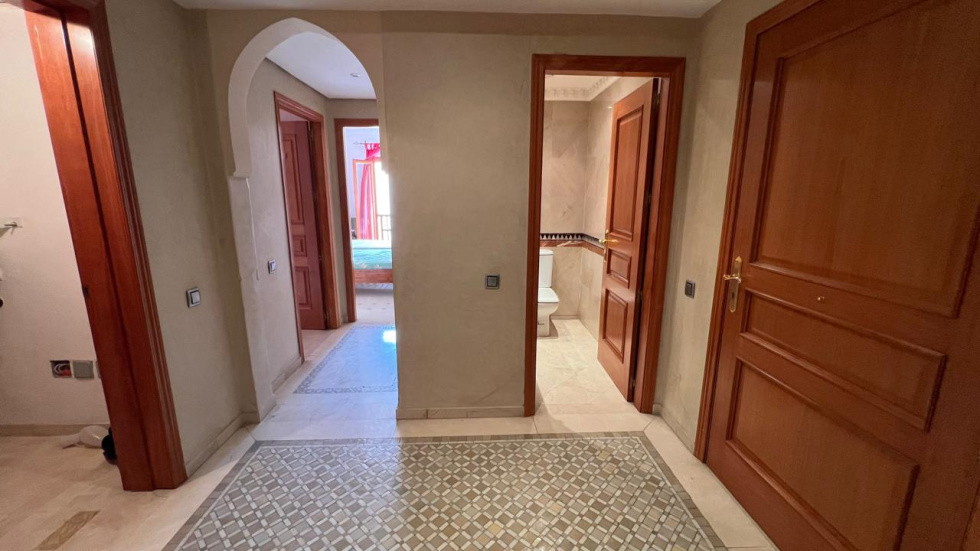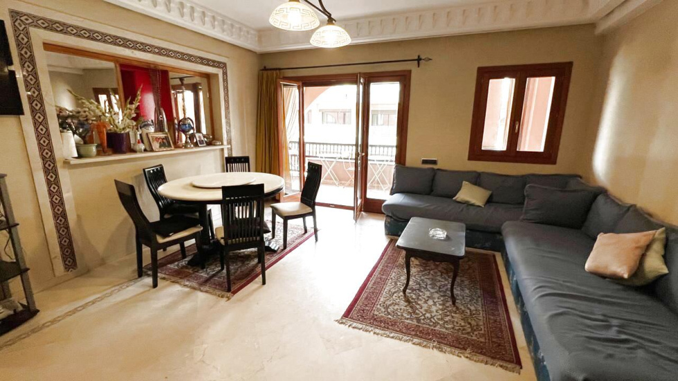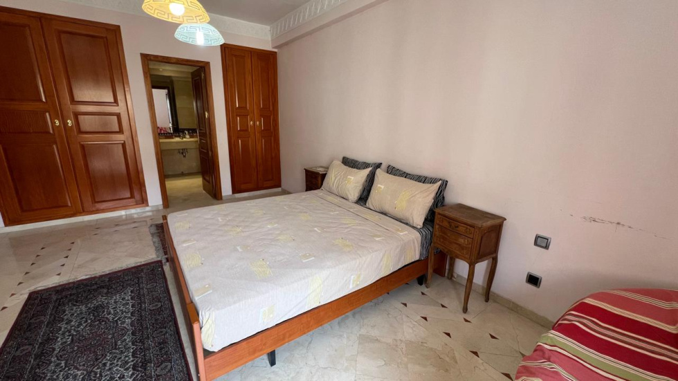 Bel appartement traversant situé dans la résidence de standing au coeur de Guéliz, au coeur et comprenant : 1 hall, 1 wc invités, 1 salon/ SAM donnant sur TERRASSE couverte, 1 débarras, 1 cuisine entièrement équipée semi-ouverte, 2 chambres avec placards + 2 SDB attenantes et 1 parking titré de 13 m². Entièrement climatisé, volets électriques, marbre au sol, au calme, non loin de la Médina et à côté du Mc Do Mohamed V. HFA