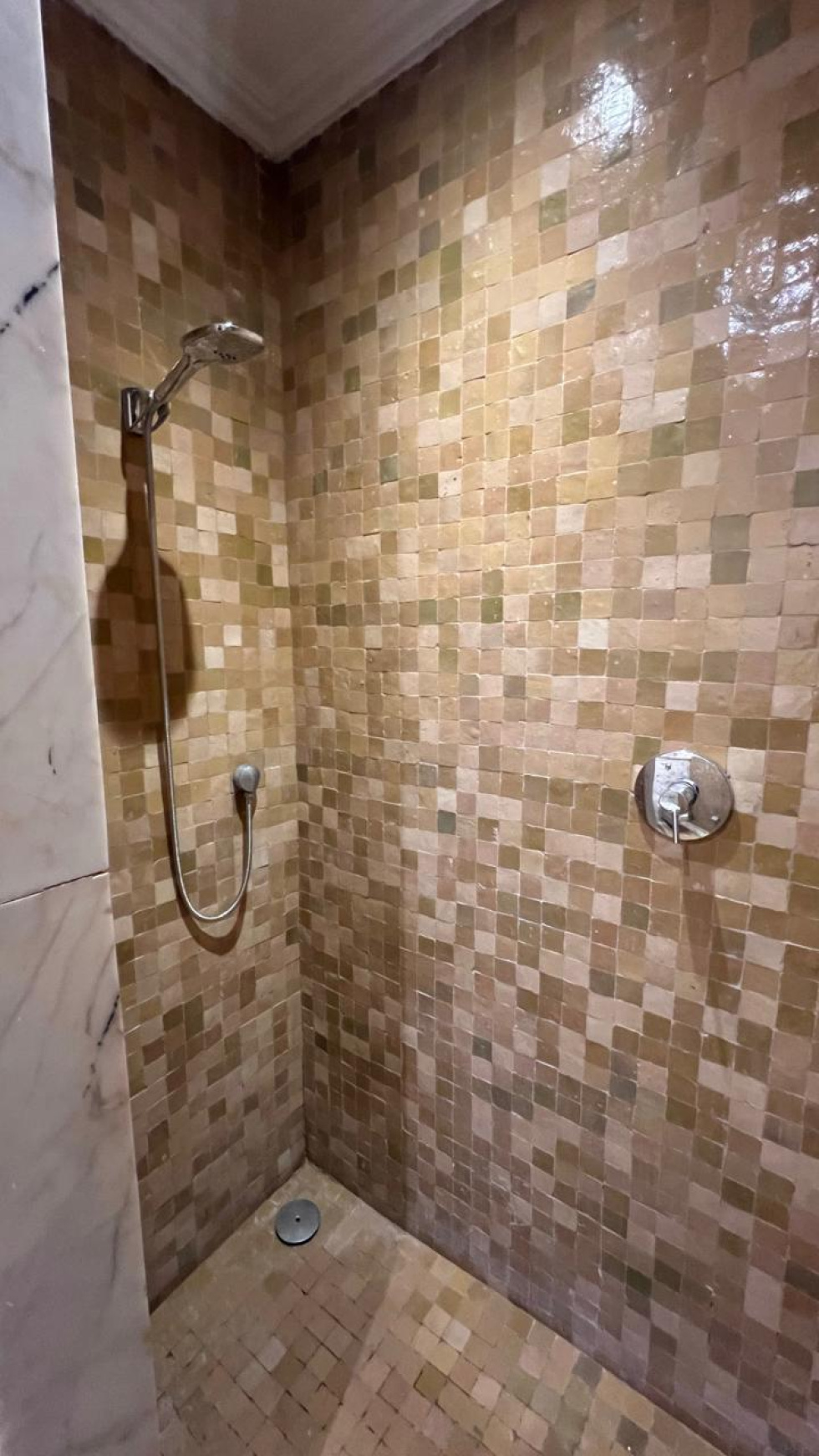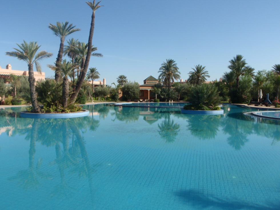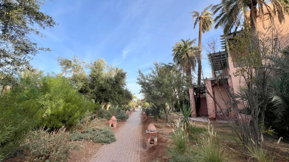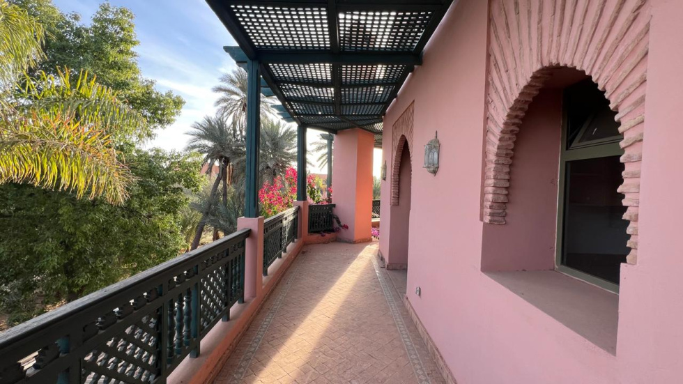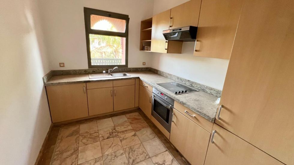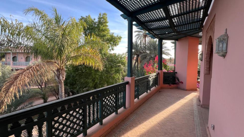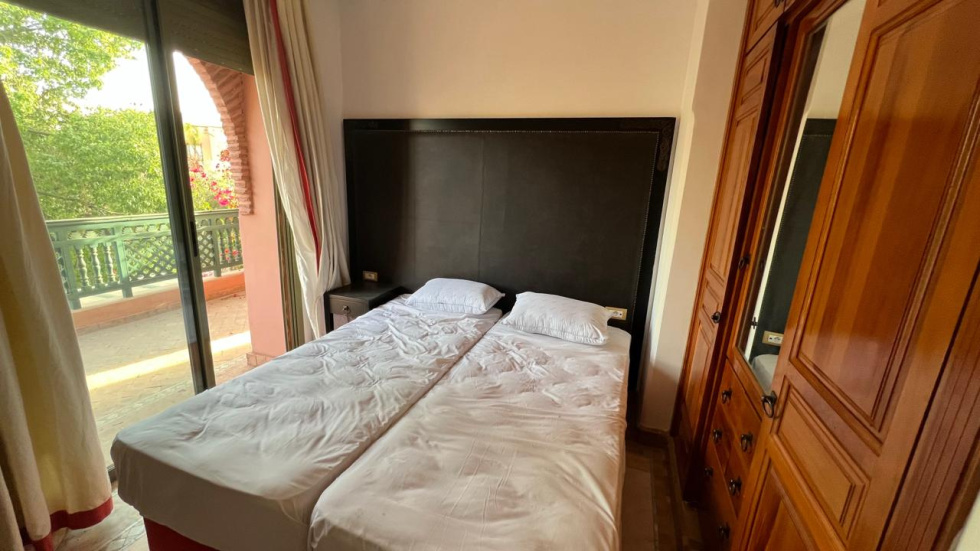 Nous retrouvons tout le charme d'un appartement de standing aux allures marocain chic et authentique qui se compose de : 1 salon/ SAM donnant sur TERRASSE faisant tout le tour, 1 cuisine équipée, 2 chambres dont 1 parentale avec Dressing + SDB attenante (baignoire), 1 autre SDE (douche), parking extérieur sécurisé...Entièrement climatisé, orienté Sud, PISCINE collective, restaurant, le calme absolu et le charme d'un environnement verdoyant. HFA